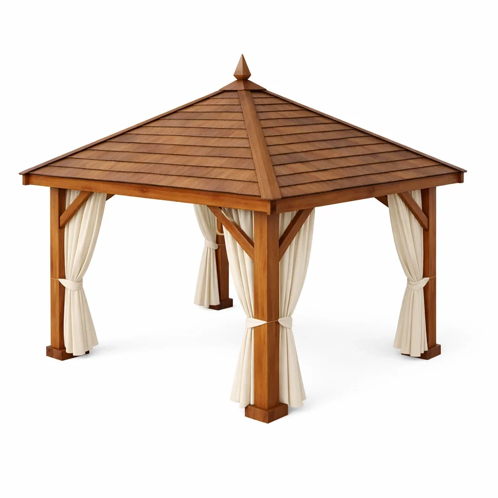 Gazebo in legno con tendaggi in poliestere crema