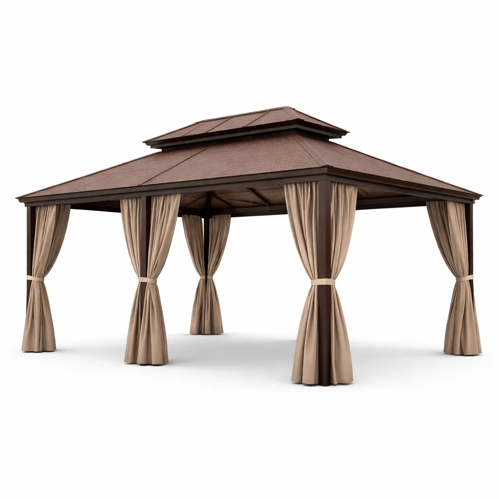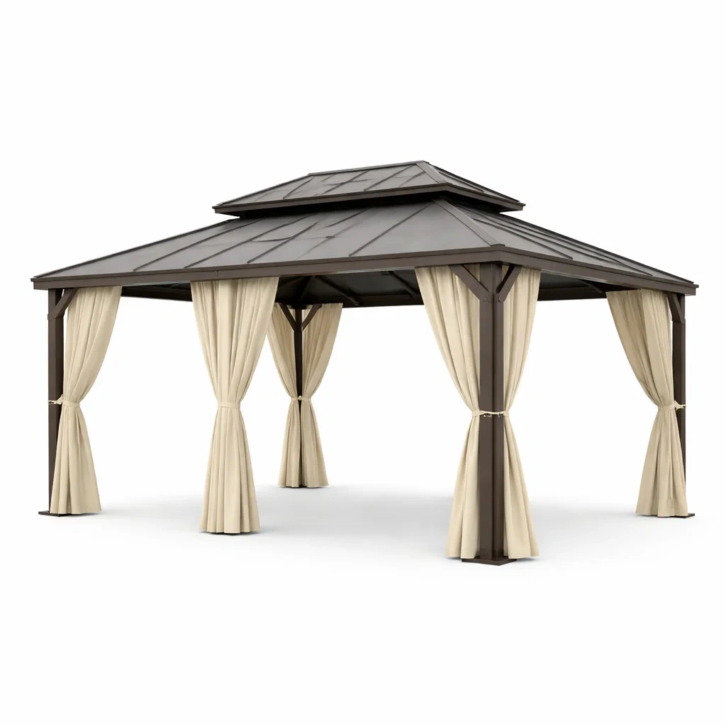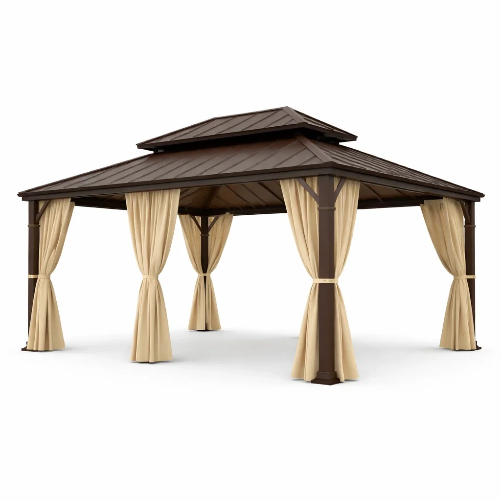 Gazebo in metallo con tetto in acciaio e tende in poliestere