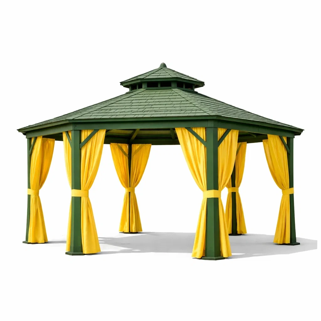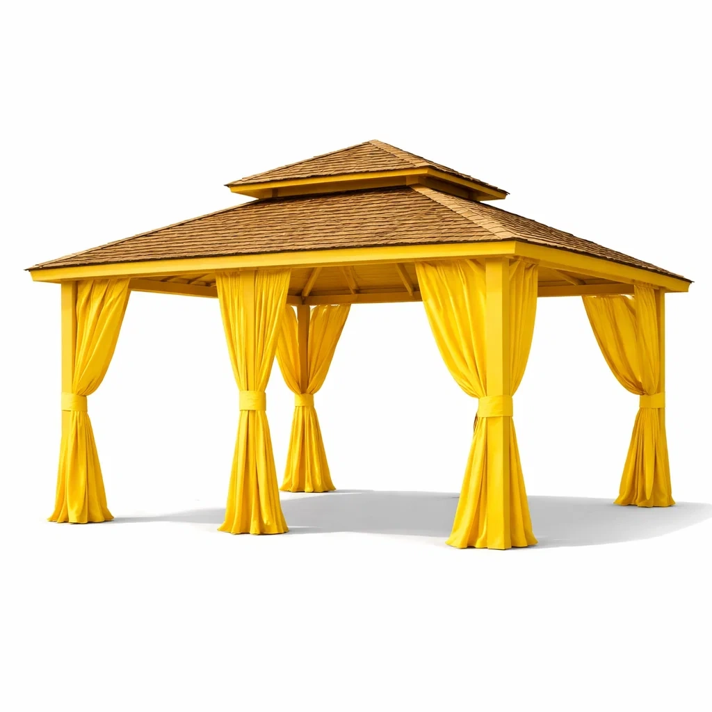 Gazebo in legno e tessuto poliestere impermeabile giallo con scandole in legno
