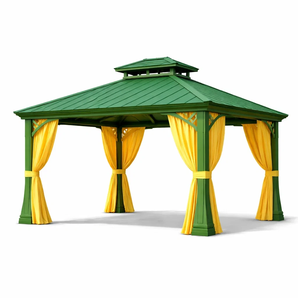 Gazebo in acciaio con tende in poliestere verde e giallo