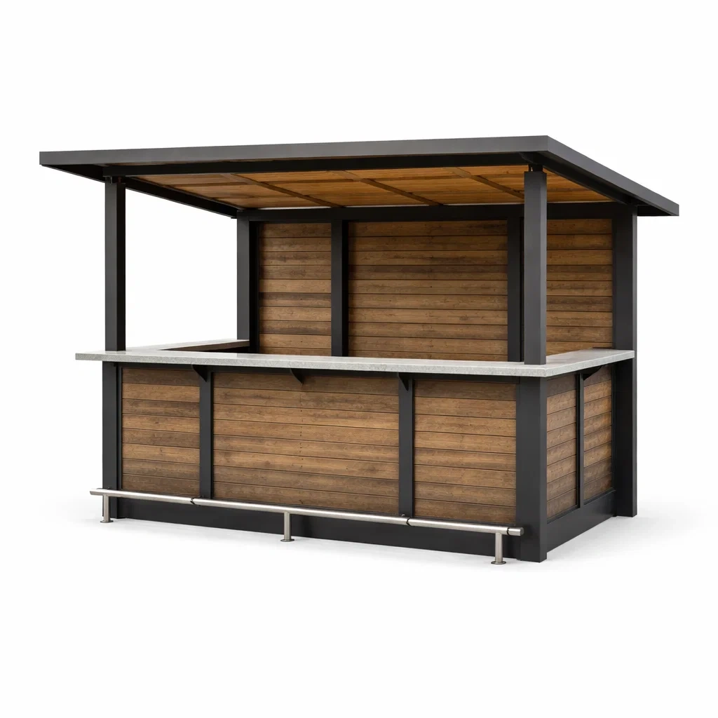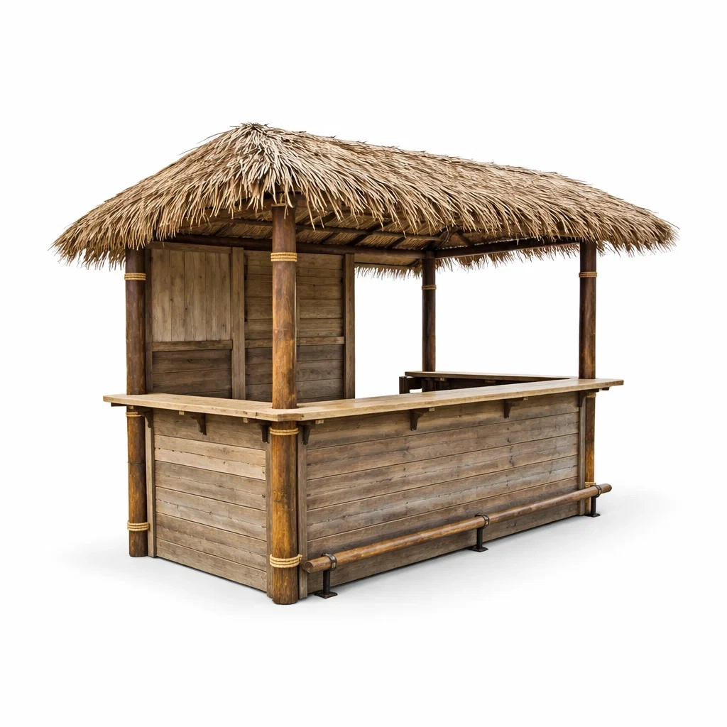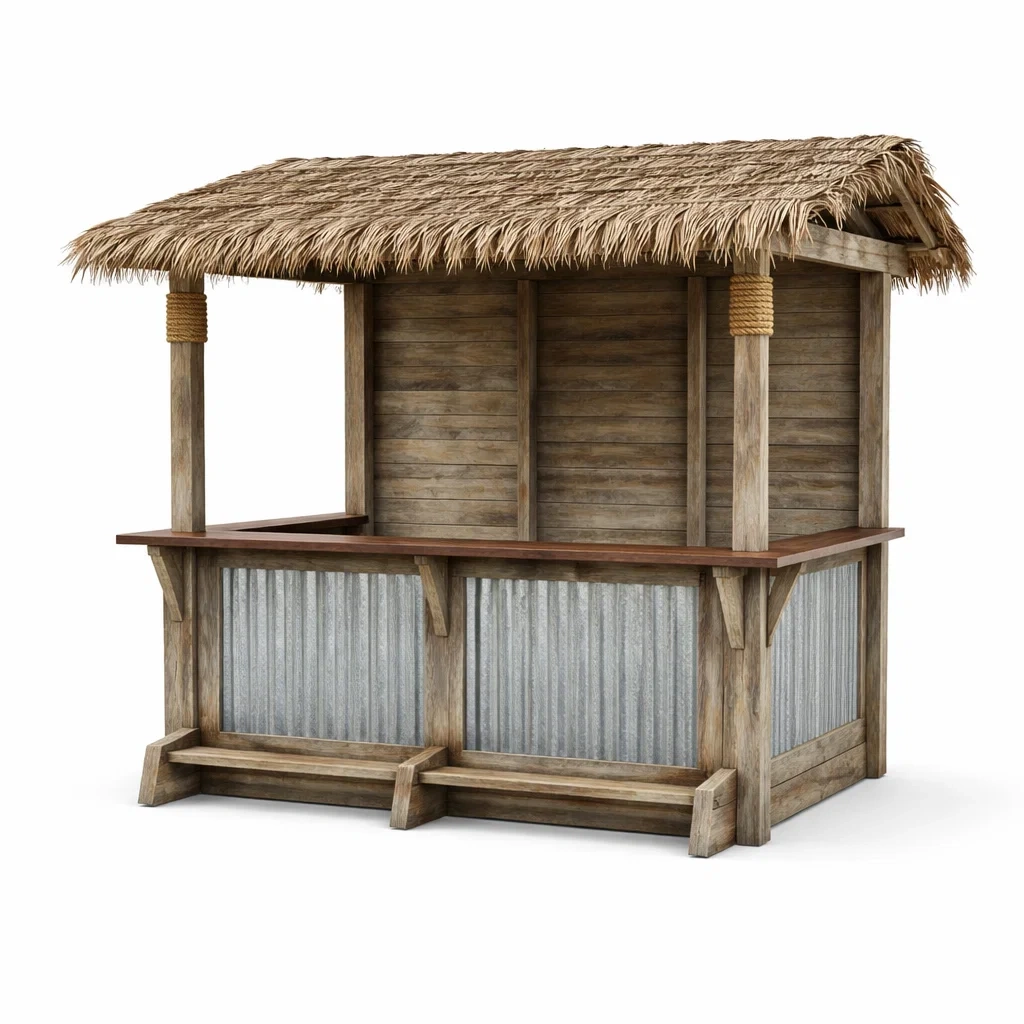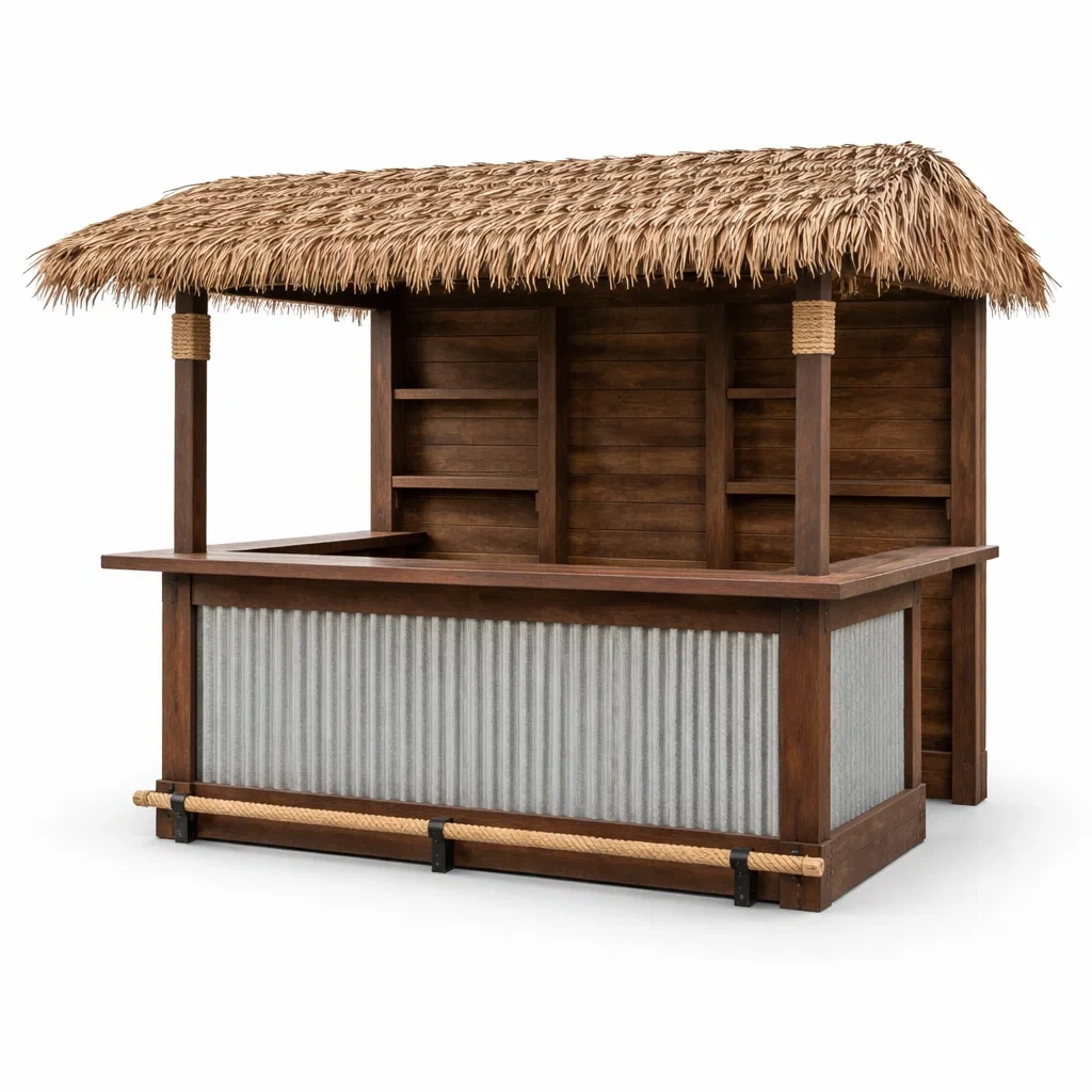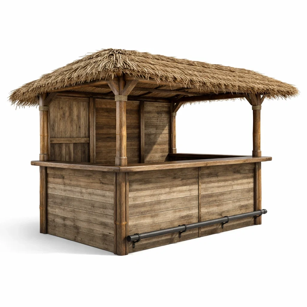 Padiglione bar in legno con tetto in paglia e pannelli in metallo