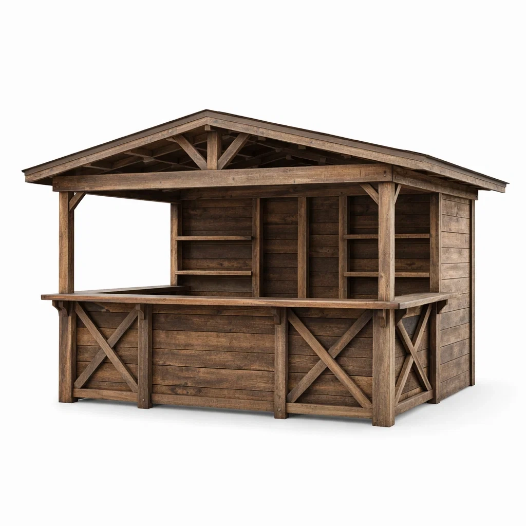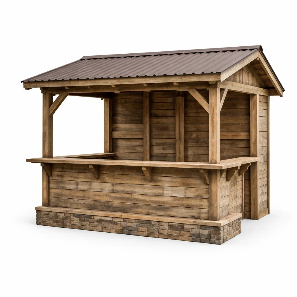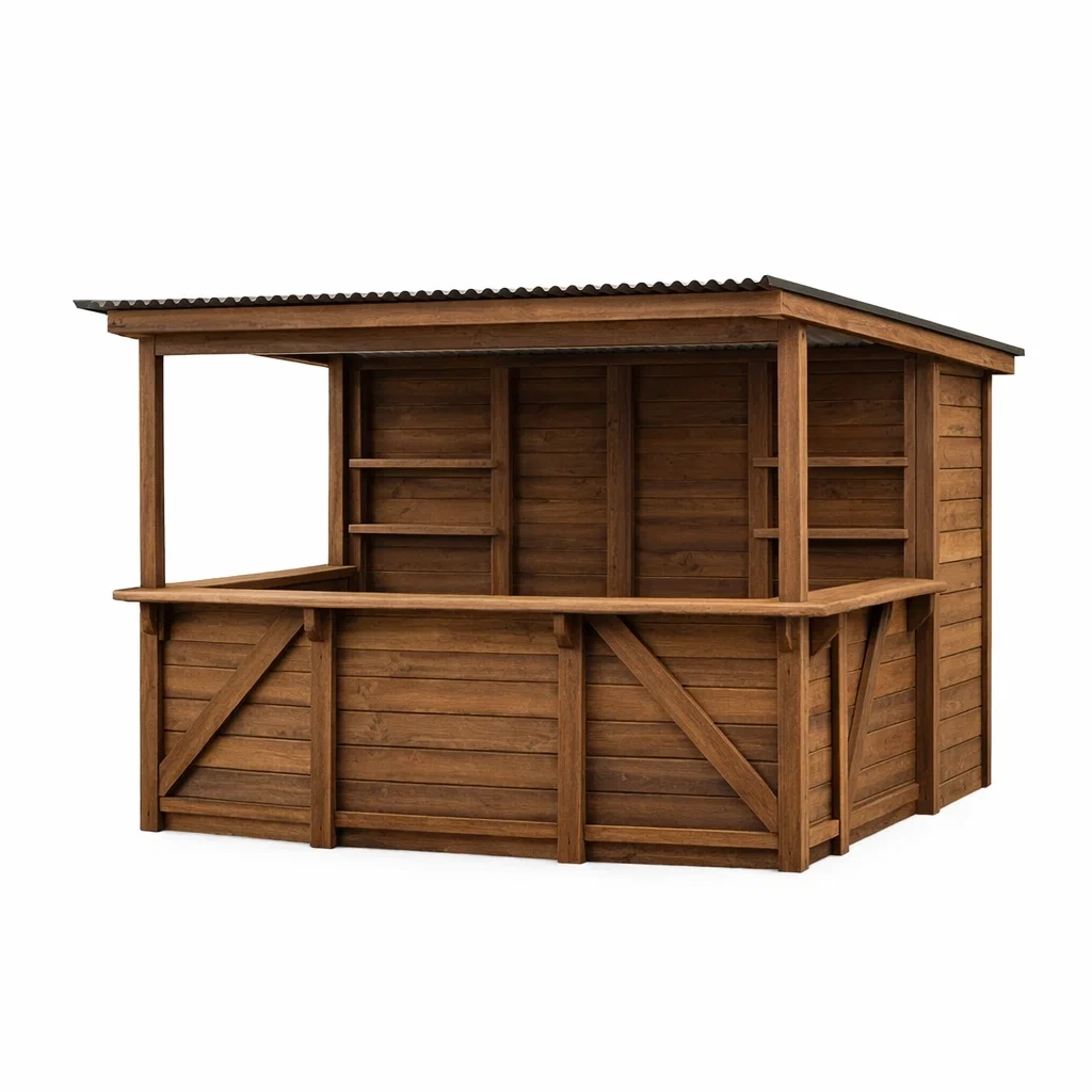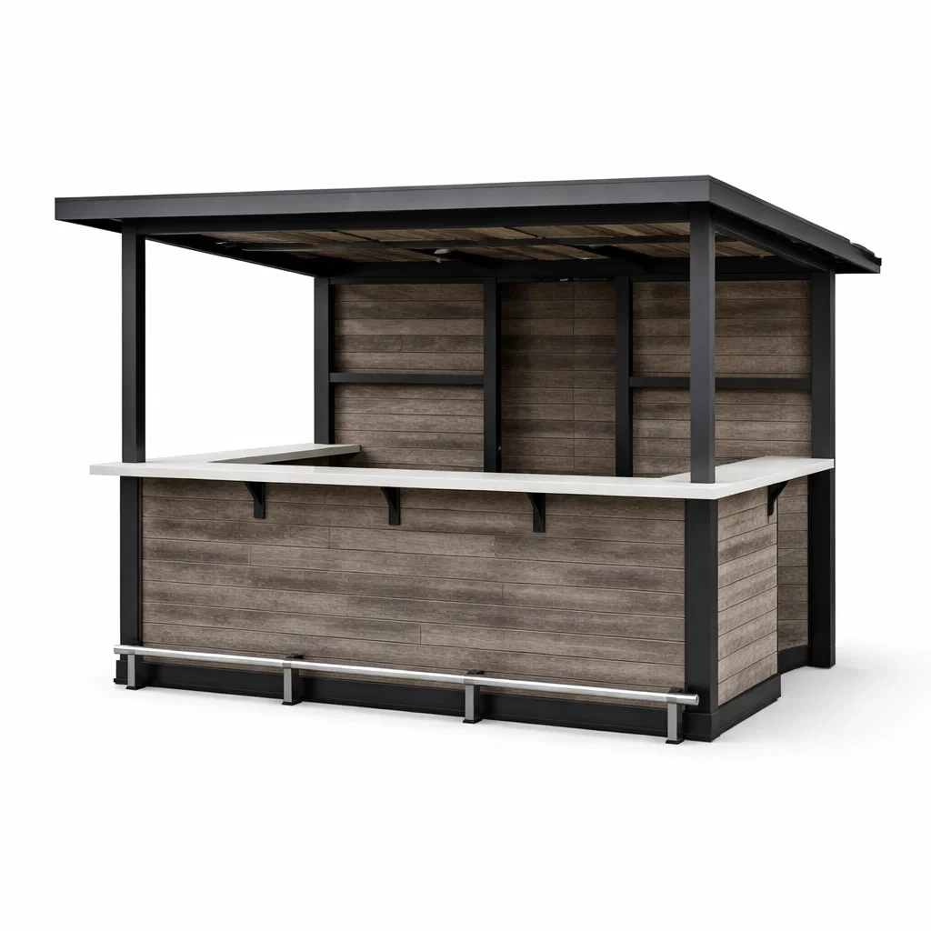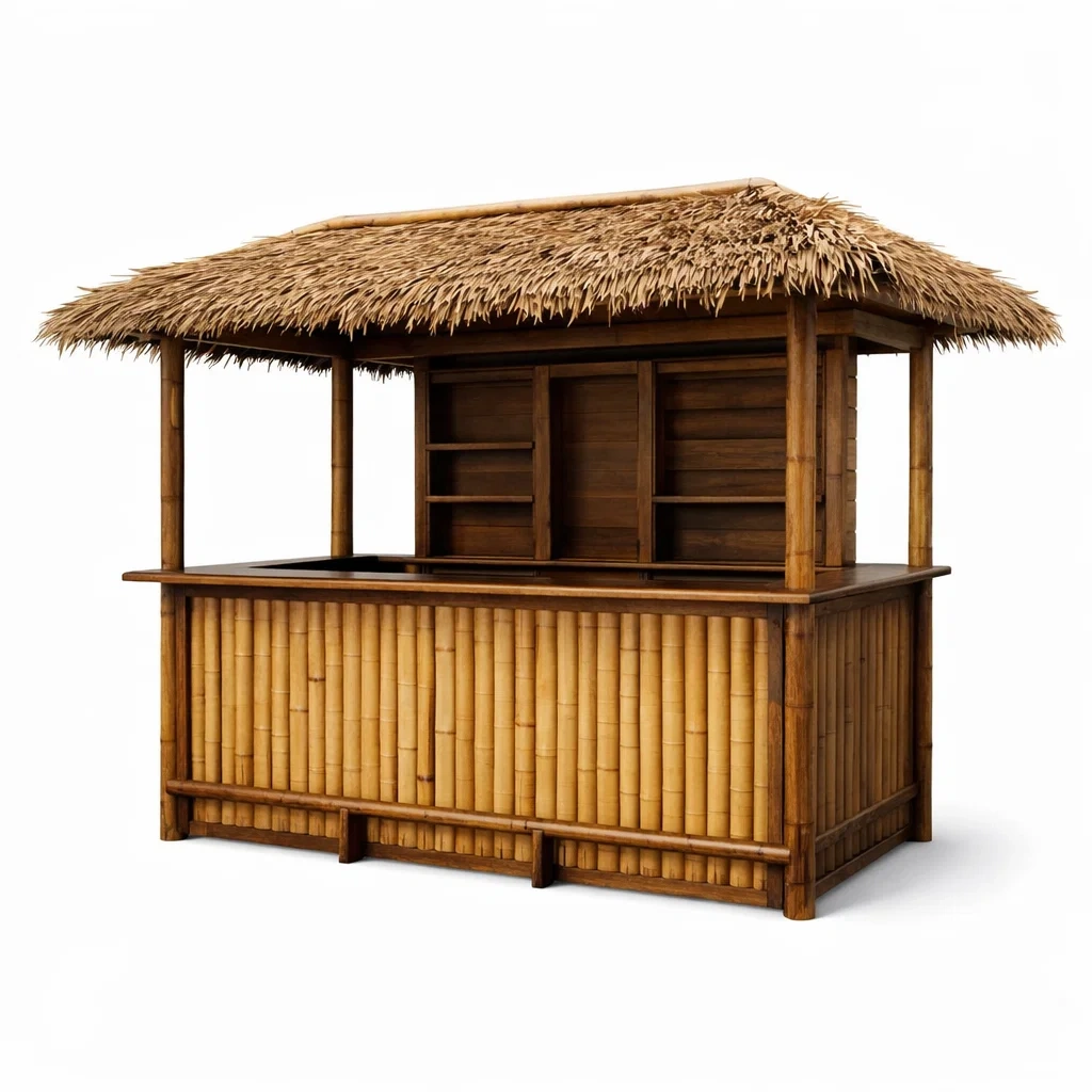 Padiglione bar in legno con tetto in paglia e pannelli in metallo