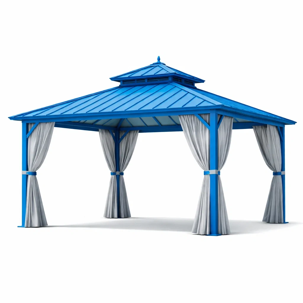 Struttura in alluminio resistente con copertura e tende in tessuto di poliestere.