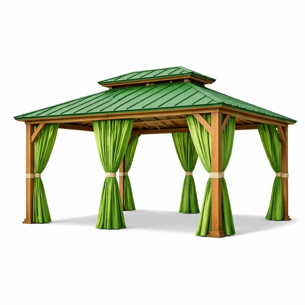 Materiali: Struttura in legno massello, copertura in acciaio verniciato, tende in poliestere.