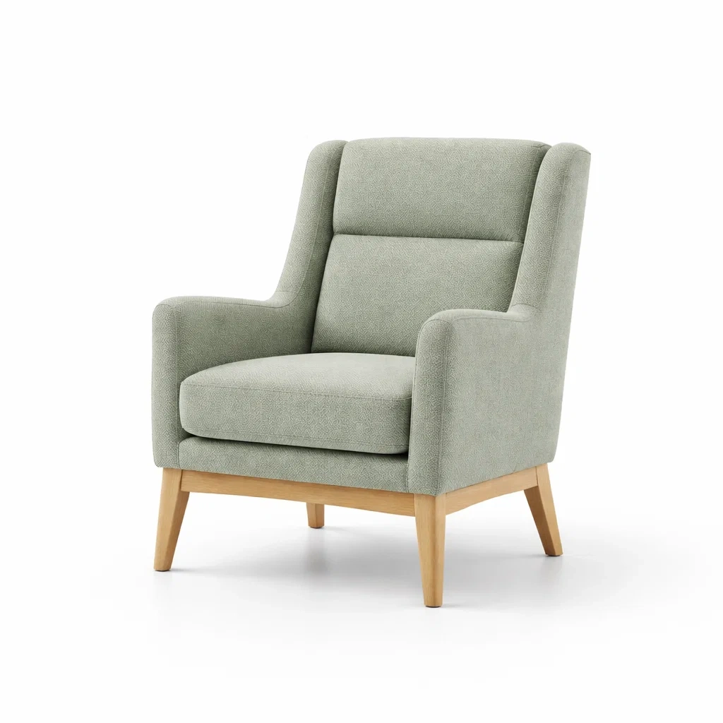 Poltrona con rivestimento in tessuto poliestere e struttura in legno massello di quercia.