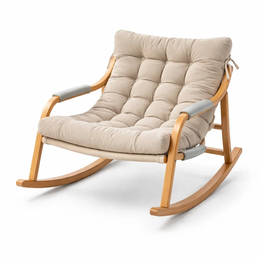 Materiali: Struttura in legno di faggio, cuscini imbottiti in fibra di poliestere, rivestiti in tessuto di cotone.